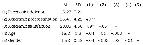 As shown in Table 1, Facebook addiction was positively associated with academic procrastination and academic satisfaction. There was a low-to-moderate correlation between all of the variables (r = .09 - .40). Academic procrastination was not significantly associated with academic satisfaction (p > .05). Table 1 also shows that there were no significant differences in Facebook addiction, academic procrastination, and academic satisfaction between student groups in terms of gender and age (p > .05).