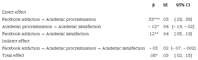As shown in Table 2, Facebook addiction significantly predicted academic procrastination (β = .33, SE = .03, CI = [.28, .38]). Academic procrastination significantly predicted academic satisfaction (β = -.12, SE = .04, CI = [-.19, -.02]). Facebook addiction significantly predicted academic satisfaction (β = .12, SE = .04, CI = [.05, .19]). The indirect effect of Facebook addiction on academic satisfaction through academic procrastination was significant (β = -.03, SE = .02, CI = [-.07, -.002]). The total effect of Facebook addiction on academic satisfaction was significant (β = .08, SE = .03, CI = [.02, .15]). These results showed that academic procrastination partially mediates the relationship between Facebook addiction and academic satisfaction.