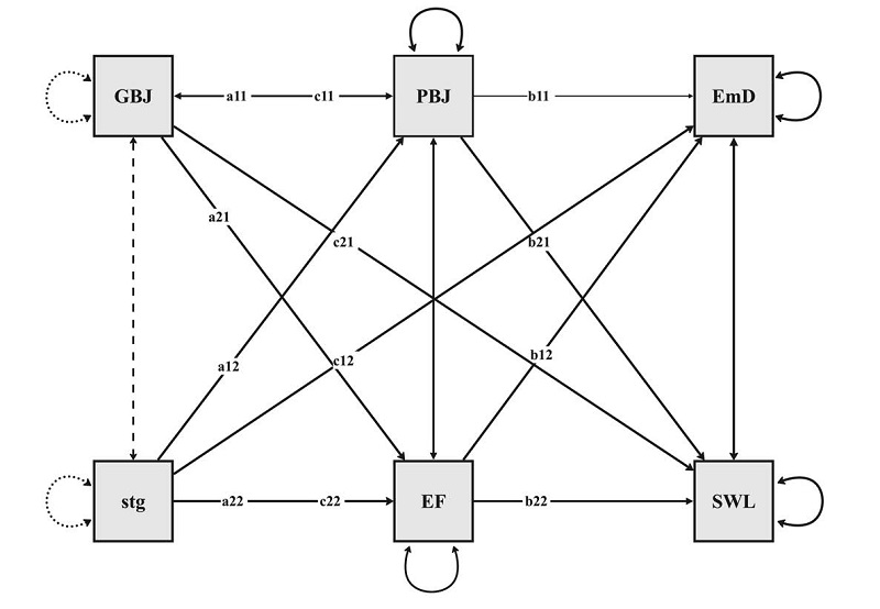 For testing Hypotheses 2A and 2B, mediation analysis was conducted using module SEM of JASP (version 0.18.3). A path model with two predictors stage and GBJW, two mediators EF and PBJW, and two outcome variables EmDisc and SWL was tested (Figure 2). In accordance with hypothesis 2A, statistically significant paths a12 and a22 were expected, with statistically nonsignificant estimates of paths c12 and c22. Hypothesis 2B predicted statistically significant paths a11 and a21, with statistically nonsignificant path estimates c11 and c21.
