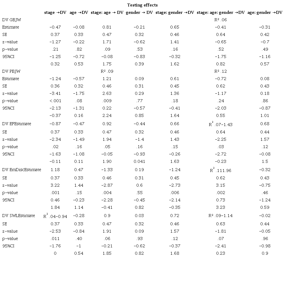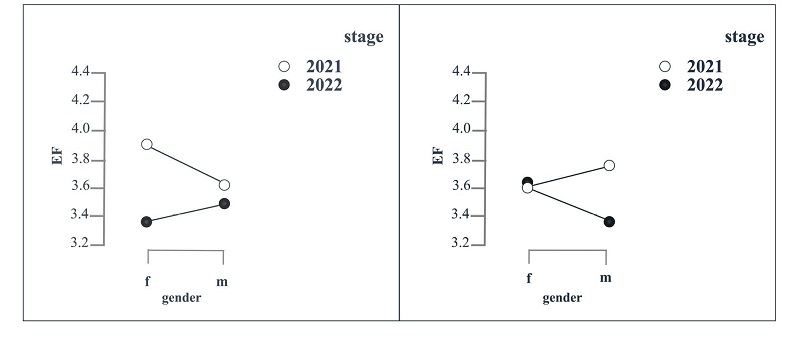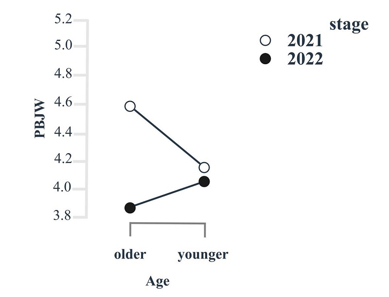 Statistically significant differences between the data obtained in 2022 and 2021 were also confirmed for PBJW, EF, and EmDisc. However, the effect of the moderator age on the influence of the independent variable stage on PBJW, the effects of the moderators age and gender on the influence of stage on EmDisc, and the interaction effects of age and gender on the influence of stage on EmDisc and EF were also confirmed. In such cases, it should be noted that the influence of the independent variable on the dependent variables applies only to the data at the level of the moderator/interactions of moderators where this influence was confirmed.