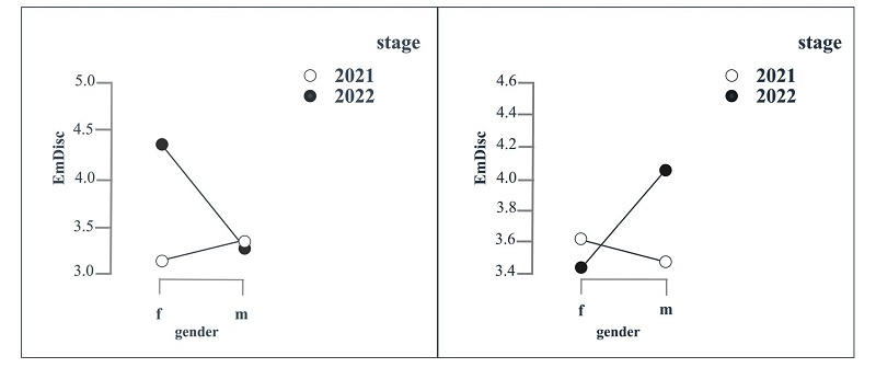 Significant differences in the level of EmDisc were confirmed only for the group of older women, who experienced higher EmDisc in 2022 compared to 2021 (z = 3.22, p = .001, CI [.39, 1.82]) (Figure 5, left). Although a similar trend is observed in the group of younger men (Figure 5, right), the effect of “stage” on EmDisc in this group is not statistically significant (z = 1.80, p = .072, CI [-.08, 1.18]).