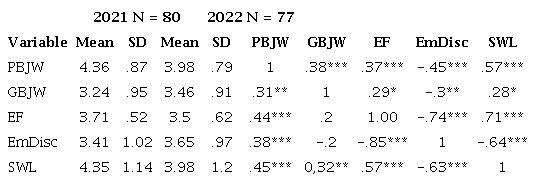 First, it should be noted that GBJW was the only variable that did not change in 2022 compared to 2021, even when considering potential moderation effects. SWL indicators were statistically significantly lower in 2022 compared to 2021 (p = .011) (Table 1). The dependence of this decrease on the variables age and gender and their interaction was not confirmed.