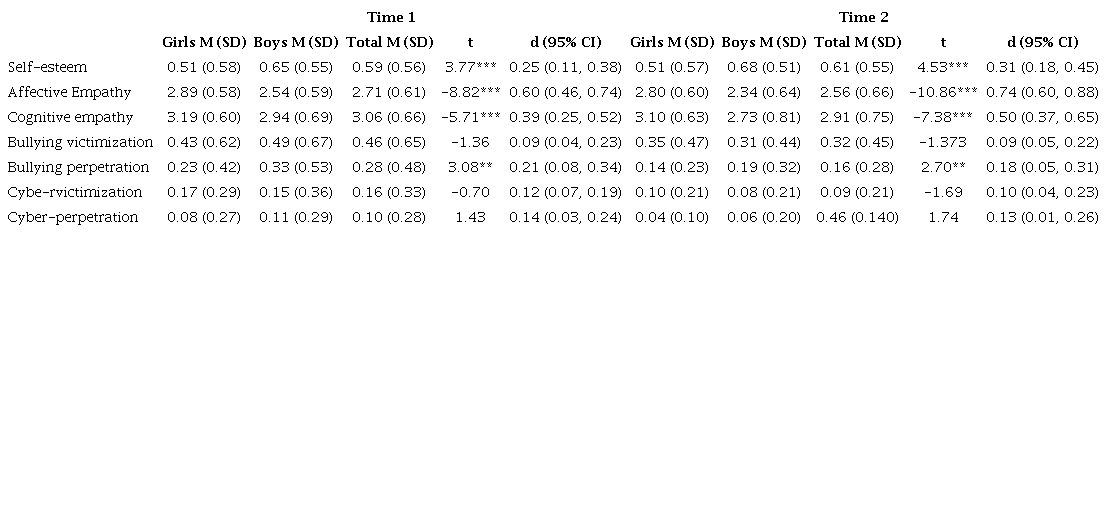 Table 1 shows descriptive statistics for all the study variables in time 1 and time 2. These results include means and standard deviations for the total sample and a comparison between males and females. Boys reported higher score of self-esteem in comparison to girls at T1 (d = 0.25, 95% CI = [0.11, 0.38]) and T2 (d = 0.31, 95% CI = [0.18, 0.45]). Regarding empathy, both affective at T1 (d = 0.60, 95% CI = [0.46, 0.74]) and T2 (d = 0.74, 95% CI = [0.60, 0.88]) and cognitive at T1 (d = 0.39, 95% CI = [0.25, 0.52]) at T2 (d = 0.50, 95% CI = [0.37, 0.65]) empathy were higher in girls in both time 1 and time 2. Bullying perpetration was higher in boys in both T1 (d = 0.21, 95% CI = [0.08, 0.34]) and T2 (d = 0.18, 95% CI = [0.05, 0.31]).