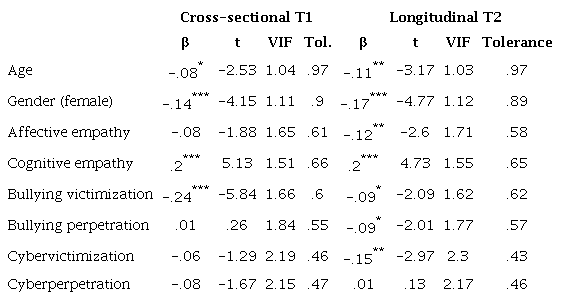 It was found that younger age was related to lower self-esteem cross-sectionally (β = -.081, p < .05) and longitudinally (β = -.108, p < .001). Being male was related to higher self-esteem cross-sectionally (β = -.136, p < .001) and longitudinally (β = -.170, p < .001). High cognitive empathy was related to high self-esteem cross-sectionally (β = .197, p < .001) and three months later (β = .198, p < .001). High affective empathy was related to low self-esteem longitudinally (β = -.115, p < .001). Bullying victimization was related to low self-esteem cross-sectionally (β = -.235, p < .001) and three months later (β = -.090, p < .001). Bullying perpetration was related to low self-esteem three months later (β = -.090, p < .05). Cybervictimization was related to low self-esteem three months later (β = -.151, p < .001). The Durbin Watson test for the presence of autocorrelation in the regression residuals gave a value of 1.845.