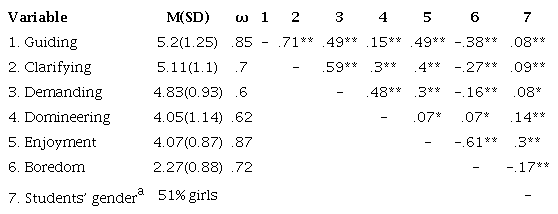 The correlations (see in Table 1) between the approaches of high teacher directiveness followed the pattern of the circumplex model. Additionally, the guiding, clarifying, demanding, and domineering approaches were significantly and positively correlated with enjoyment. In contrast, guiding, clarifying, and demanding were significantly and negatively correlated with boredom, whereas domineering was significantly and positively correlated.