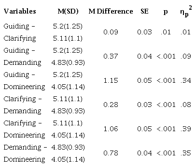 Table 1 reports descriptive statistics, composite reliability, and bivariate correlations for all study variables. Regarding the four high directiveness approaches, mean scores are above the midpoint of the measurement scale for guiding, clarifying, demanding, and domineering. In particular, Table 2 shows repeated measures ANOVA where guiding approach was the most significantly perceived high directiveness approach by students, followed by clarifying, demanding, and domineering approach.
