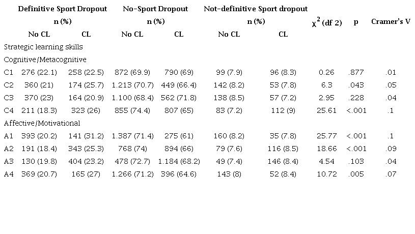 Table 1 reports a significantly important effect of the distribution of the sports dropout rates (definitive and not-definitive) associated with affective-motivational learning skills. Differently, in the cognitive-metacognitive dimension, only the C4 factor-scale showed a significant effect in association with both definitive and not-definitive dropout rates. Furthermore, the distribution of the sample across the no-sport dropout category linked with strategic learning skills revealed higher frequencies of students comparing to the definitive and not definitive sport dropout categories.