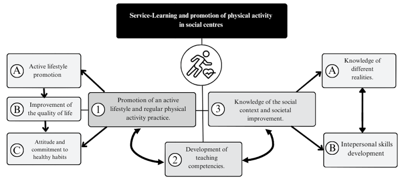 From an educational field, physical activity is the primary tool for the education and prevention of conditions that may affect students’ development, quality of life, or life expectancy (Pérez-Pueyo et al., 2019). However, in this context, it is more appropriate to link health promotion from a salutogenic approach, where its practice is integrated into students’ lifestyles (Antonovsky, 1996). In this way, the school-society partnership can mutually benefit from initiatives that positively impact society (Yook, 2018) and contribute to the holistic development of students. To achieve this, initial teacher training faces the challenge of implementing educational models that ensure high-quality preparation for future physical education teachers. Therefore, it is essential that they develop professional competencies in real-world contexts while promoting regular physical activity and healthy habits within society. One of the most suitable pedagogical models to achieve this is Service-Learning (SL) (Bringle & Clayton, 2021; Chiva-Bartoll & Fernández-Río, 2022; Linker et al., 2019), through which students acquire meaningful curricular knowledge while providing a service to the community with a civic commitment to build a more just society, in this case through physical and sporting activities that positively impact health (Sánchez-Matas et al., 2023) and improve the lives of others (Batlle, 2020).