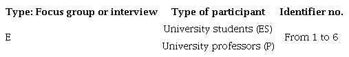 The information collected from the interviews and focus groups was initially coded and categorized inductively using the qualitative analysis software Atlas.ti 7.5.4 version Table 1 presents the coding scheme established for identifying the transcriptions of the focus groups and interviews conducted for this research.