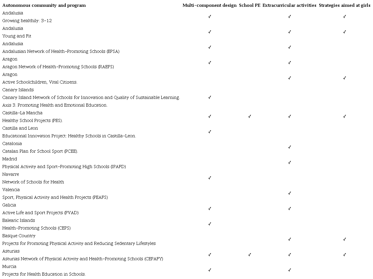 Of all the elements proposed in these studies, only those difficult to assess in a design evaluation were excluded. Specifically, issues related to the limitations of the environment were omitted, as they greatly depend on the specific reality in which the actions are undertaken a posteriori; and those associated with the use of technological devices in developing and monitoring the interventions, due to the difficulties in guaranteeing that these resources can be extended and made available to all the individuals targeted by the strategies. Thus, the elements we analyzed in PA promotion strategies were as follows: 1) planning based on a multi-component design; 2) intervention within school PE; 3) extension of actions to extracurricular activities; 4) inclusion of strategies specifically oriented towards girls; 5) measures to foster the involvement of school leaders and teachers; 6) teacher training; 7) collaboration with agents and institutions in the autonomous community; 8) evaluation procedures.