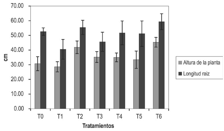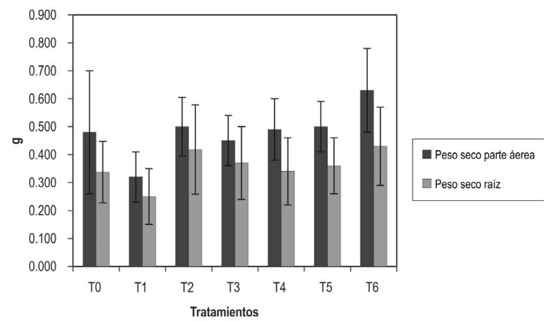 Tanto el peso seco aéreo como el peso seco de la raíz presentaron diferencias estadísticamente significativas (p≤ 0,05) según el ANOVA y prueba de Tukey (figura 2). El tratamiento T6: KISA 34 + KISA 71+25% (RF) mostró un incremento de la media del peso seco aéreo de 26,7 % y un incremento de 10,3 % en la media de peso seco de raíz con respecto al T2 de fertilización química completa.