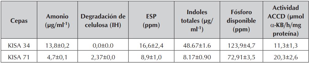 Los aislados KISA 34 Y KISA 71 tienen la capacidad de solubilizar fósforo, producir índoles totales, NH3, expolisacáridos, y tienen actividad ACC desaminasa (tabla 1). Esto coincide con reportes previos de cepas de diferentes especies pertenecientes al género Bacillus como de B. licheniformis, B. pumilus, B. coagulans, B. insolitus, B. simplex, B. amyloliquefaciens, B. Thuringensis, B. altitudinis, B. megaterium y B. subtilis, con capacidad de producir índoles totales (Lambrecht et al., 2000; Lara et al., 2011), solubilizar fosfatos (Ahmad et al., 2008; Upadhyay et al., 2011; Nautiyal et al. 2013; Kavamura et al., 2013; Goswami et al., 2014; Kumar et al., 2014; Goswami et al., 2015), ACC deaminasa (Shen et al., 2012; Angulo et al., 2014), EPS, y producir NH3 (Upadhyay et al., 2011; Yadav et al., 2014). Bacillus amyloliquefaciens KISA 34 no presentó actividad celulolítica (tabla 1).