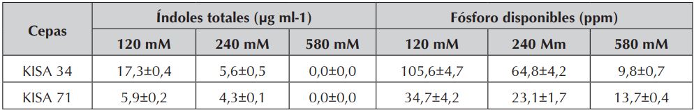 Caracterización de las cepas seleccionadas bajo condiciones de estrés. En este estudio, bajo condiciones de estrés salino a concentraciones de 120 mM y 240 mM de NaCl, B. amyloliquefaciens KISA 34 y B. subtilis KISA 71 presentaron actividad de producción de índoles. Sin embargo, a una concentración de 580 mM de NaCl no se presentó esta actividad. En la determinación cuantitativa de fósforo soluble los resultados mostraron que el B. amyloliquefaciens KISA 34 y B. subtilis KISA 71 presentaron solubilización de fósforo en presencia de los tres niveles de estrés salino, disminuyendo esta actividad a medida que el porcentaje de sal aumentó (tabla 2).