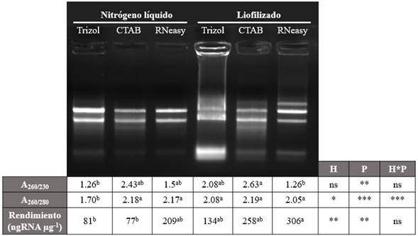 Las soluciones de ARN obtenidas se cuantificaron con un espectrofotómetro Nanodrop ND-2000 (Thermo scientific). Se determinó la pureza del ARN en cada muestra por medio de relaciones de absorbancia A260/A280 y A260/A230 y el rendimiento fue calculado como la cantidad de ARN obtenido (ng) sobre el peso de micelio utilizado para la extracción (µg), las extracciones se realizaron por triplicado. Los resultados de pureza y rendimiento fueron analizados mediante ANOVA y pruebas de comparación de medias de Tukey (α<0.01) siguiendo un diseño factorial completamente al azar, posterior a la revisión de supuestos de normalidad (Lilliefors: p>0.05) y homogeneidad de varianzas (Fligner-Killeen: p>0.05). Los datos obtenidos fueron procesados con el programa estadístico R 3.4.0. Además, se constató y documento la integridad del ARN mediante visualización directa en gel de electroforesis (agarosa al 1% teñido con Bromuro de etidio, 100V por 15min) mediante un visualizador de imágenes ChemiDoc MP system (BioRad). Los procesos de extracción de RNA se llevaron a cabo en el laboratorio de Agrobiotecnología de la FCA de la UNAL, sede Bogotá y la visualización en el laboratorio de Biología de la Facultad de Ciencias de la UNAL.