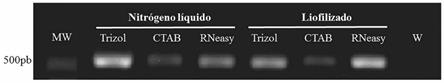 Particularmente el ARN obtenido con el protocolo con CTAB generó una banda tenue en comparación con las obtenidas con ARN proveniente de otras metodologías de extracción. Estos resultados sugieren que el ARN obtenido mediante este protocolo posiblemente generó una disminución en la eficiencia de la reacción de RT-PCR. Sánchez et al. (2008), reporta que incluso después de centrifugación, considerables cantidades remanentes de buffer de lisis pueden permanecer atrapadas en los espacios internos del material amorfo precipitado y trazas de inhibidores de detergentes como el SDS podrían tener un efecto sobre la eficiencia de la reacción de PCR (Rossen et al., 1992), generando finalmente bandas tenues en el gel de electroforesis.