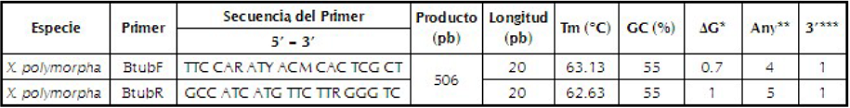 Se diseñó un juego de cebadores a partir de un alineamiento múltiple de veintitrés secuencias de ADN del gen β-tubulina obtenidas de veintitrés especies de la familia Xylariaceae y diez secuencias adicionales de diversos ascomicetes almacenadas en la base de datos NCBI usando BLAST (accesiones: HM585018, GQ502718, GQ502698, GQ502712, GQ502703, GQ502710, GQ502697, GQ487702, GQ487701, GQ495955, GQ502685, GQ502707, GQ478209, GQ502706, GQ495945, AB625369, GQ502692, GQ478222, JX868543, EF025617, JX868550, GQ478226, EF025606, AY951665, AY951734, GQ478213, GQ470224, GQ470228, EF025607, GQ470220, EF025616, GQ478211, JQ691672. Última fecha de acceso: Marzo 2017). Las secuencias consenso se identificaron a partir de alineamientos múltiples para lo cual se utilizó los programas ClustalX2 y GeneDoc. También se utilizaron los programas Primer3, Oligo Analyzer y mFold para el diseño de cebadores y análisis de las propiedades termodinámicas in silico. Los cebadores fueron diseñados teniendo como referencia los siguientes parámetros: temperatura de disociación (Tm: 55-65°C), contenido de Guaninas y Citosinas (GC%: 50-55%), energía óptima para ruptura de estructuras secundarias (ΔG>-9Kcal/mol), tendencia del primer a formar estructuras secundarias con si mismo (3>Any number) y con su extremo 3` (3 > 3` number) (Dieffenbach et al., 1993; Arif & Ochoa-Corona, 2013).