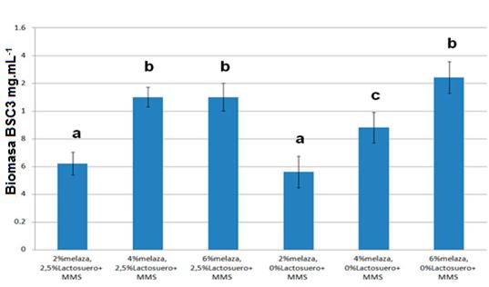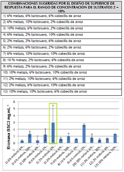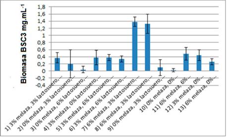 El medio de cultivo para la obtención de biomasa de BSC3 quedó constituido por: melaza de caña (6%) + lactosuero (2,5%) + MMS. Este resultado fue confirmado mediante otro ensayo en el que se comparó la producción de biomasa de BSC3 en los medios optimizados por cada diseño (material suplementario 3).