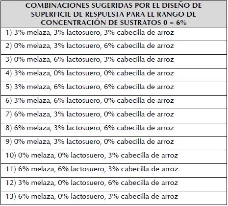 Diseño experimental. Para la optimización de las concentraciones de sustratos se utilizó un diseño de superficie de respuesta tipo Box Behnken, en el cual se evaluaron dos rangos de concentraciones de (0 - 6% y 2 -10%), con cinco repeticiones del punto central (tabla 1). Para el experimento, se utilizaron tubos de ensayo con un volumen de trabajo de 10 ml. El diseño estuvo constituido por tres factores (A: melaza; B: lactosuero; C: extracto acuoso de cabecilla de arroz) y tres niveles (+1: mayor concentración; 0: concentración media; -1: menor concentración), como variable de respuesta se tuvo en cuenta la obtención de biomasa del microorganismo en términos de peso seco. Todas las combinaciones resultantes del diseño, se prepararon con un medio mínimo de sales (MMS), con la siguiente composición en g/ L: K2HPO4, 1.73; KH2PO4, 0.68; NH4SO4, 1.0; MgSO4 7H20, 0.1; CaCl 2H2O, 0.02; MnSO4 H2O. 0.03 y FeSO4 7H2O, 0,03. (Carrillo et al., 2004). Los cultivos se incubaron a 30 ± 2 °C en agitación orbital a 250 rpm por 72 horas. Se seleccionaron las combinaciones en las que se obtuvo mayor producción de biomasa.