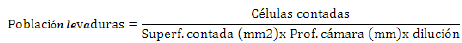 para ello se realizó una dilución de 1/100 mi de agua destilada con la adición de azul de metileno (MERCK®) al 1% (p/v) para distinguir células vivas y muertas al microscopio. Posteriormente, una gota de la dilución fue vertida en un cuadrante de la Cámara de Neubauer BOECO® y se procedió con el conteo de 5 cuadrantes medianos (extremos y centro) en microscopio óptico de campo claro ZEISS® bajo el objetivo 40x . Se calculó la población de levaduras mediante la fórmula (Mayagüez, 2007):