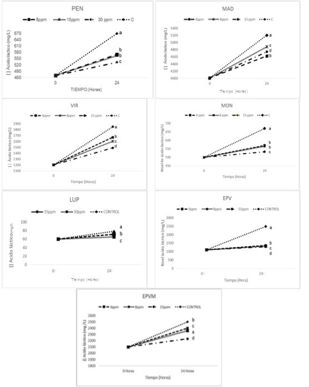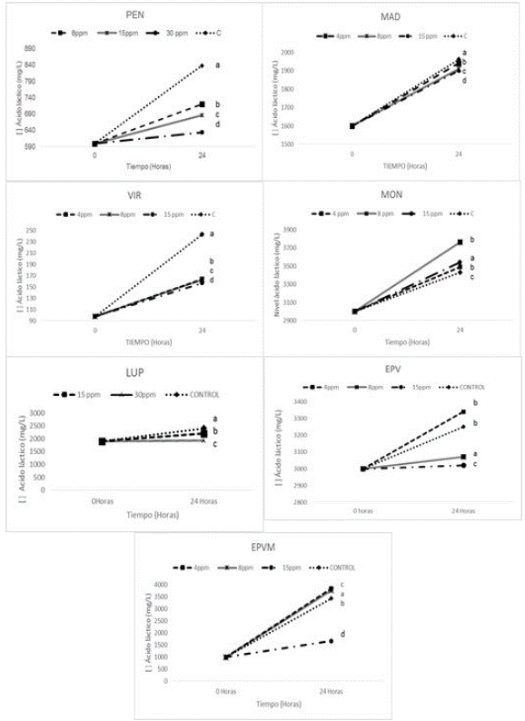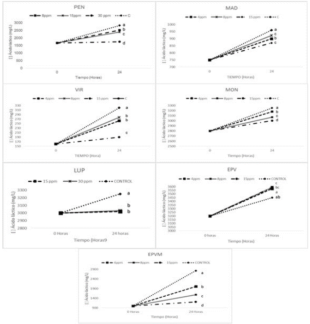Para el ensayo realizado con lúpulo (LUP) se encontró que no existen diferencias entre las concentraciones evaluadas 15 y 30 ppm. Los resultados demuestran que los cocteles de antibióticos (EPV) logran mantener la concentración de AL con valores cercanos a la concentración inicial de AL, por lo tanto su efecto no es efectivo para el control de bacterias productoras de ácido láctico; EPVM presentó diferencias entre las concentraciones 4, 8 y 15 ppm, demostrando mayor efectividad 15 ppm, según la prueba de Tukey (P≤ 0,05).