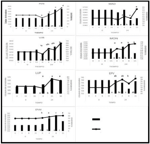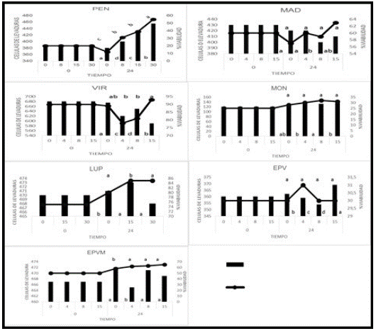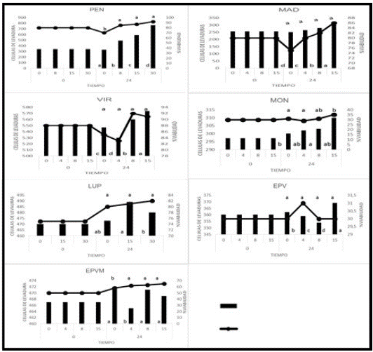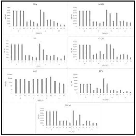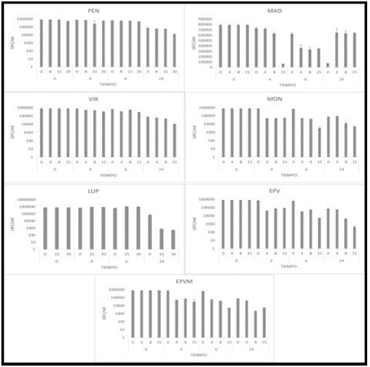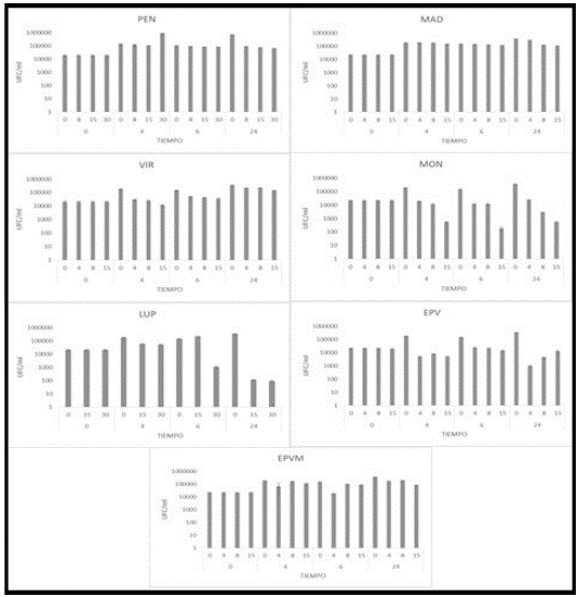 Con base en los resultados obtenidos de los de antibióticos y el antimicrobiano evaluado en cuanto a la población y viabilidad de la levadura, se observó que las 0 horas no hubo cambio en ninguno de los montajes con las concentraciones, manteniéndose sobre la misma viabilidad en cuanto a la muestra control, transcurridas las 24 horas se observan cambios en los antibióticos; PEN y VIR demostraron un mayor efecto en el aumento exponencial, MAN, LUP, EPV y EPVM demostraron variabilidad según las concentraciones utilizadas (figura 4). Por lo tanto se observó que los antibióticos ejercieron efecto transcurrido las 24 horas, sin embargo la diferencia existente entre los porcentajes de viabilidad de acuerdo al test de tukey (P≤ 0,05), son atribuidos al efecto que ocasionan los antibióticos a diferentes concentraciones según la cantidad del componente activo que genere un efecto en la fermentación.