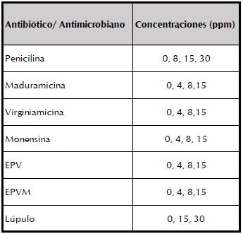 Antibióticos y antimicrobiano. Se utilizaron seis antibióticos: penicilina (PEN), maduramicina (MAD), virginiamicina (VIR), monensina (MON), coctel de penicilina, virginiamicina y maduramicina (EPV), un coctel de penicilina virginiamicina, estreptomicina y monensina (EPVM) y un antimicrobiano lúpulo (LUP).