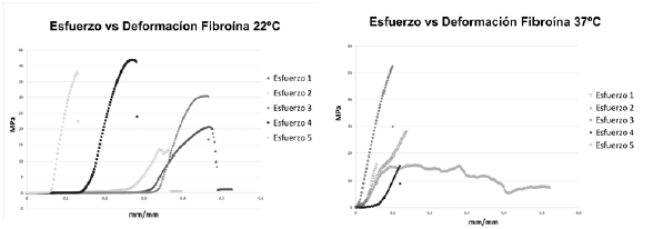 La relación entre el estado de esfuerzos inducido en películas de fibroína por la aplicación de una fuerza, y su deformación, fue representada gráficamente. Se observa una curva típica de la relación entre esfuerzo (MPa) y deformación (mm/mm) de fragmentos de películas de fibroína a temperatura ambiente (22°C) y a una temperatura de 37°C respectivamente (figura 1). El módulo de elasticidad se calculó como la pendiente de la región lineal de las curvas obtenidas, los resultados promedio fueron de 157.91 MPa a para el biomaterial a 22°C y de 245.34 para el biomaterial a 37°C.