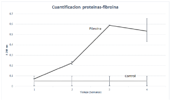 Con el fin de verificar el nivel de estabilidad de los soportes de fibroína y su degradación en condiciones de cultivo. Las películas de fibroína regenerada fueron cultivadas y evaluadas en el tiempo. Según los resultados, las películas de fibroína regenerada mostraron un incremento en la liberación de proteínas al medio circundante; ya que se observó que la densidad óptica (OD) se incrementó hasta 3 veces con respecto al control (Medio de cultivo en ausencia de películas de fibroína). La liberación de péptidos y aminoácidos a partir de la matriz logra estabilizarse a la cuarta semana ya que se observa una reducción en la OD (figura 2).