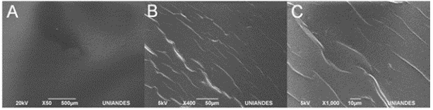 La caracterización ultraestructural de las películas de fibroína regenerada se realizó mediante la técnica de Microscopia Electrónica de Barrido (MEB), según los resultados, estas exhibieron estructuras rugosas distribuidas de forma aleatoria, la rugosidad solo fue visible a partir de un aumento de 400X, haciéndose más evidentes a 1000X (figura 3 a-c). Se realizaron cortes trasversales de películas de fibroína para verificar, su grosor y evaluar la eficacia del tratamiento para inducir laminas-β.
