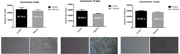 El crecimiento celular no presentó diferencias significativas con respecto al control de crecimiento; se observa una distribución homogénea del crecimiento de los fibroblastos humanos adheridos a la superficie de la película de fibroína. No hubo variación en la morfología celular del crecimiento tanto en placas revestidas de fibroína como en placas control. La citotoxicidad y el recuento celular se realizaron a los 5, 10 y 15 días de cultivo. Como se observa en la figura 6, los porcentajes de viabilidad celular oscilaron entre 90-95%, evaluada por coloración supra vital, azul de tripan, tanto para fibroblastos control como fibroblastos crecidos en las películas de fibroína.