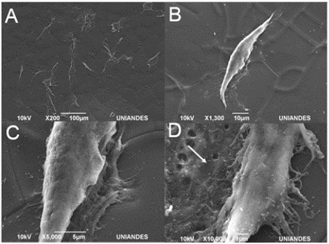 La adhesión y proliferación temprana de las células a los biomateriales son aspectos necesarios en todo proceso de regeneración. Con el fin de observar el crecimiento y los niveles de interacción de los HDFn con las matrices de fibroína, se tomaron microfotografías por MEB de fibroblastos crecidos durante 2 días en películas de fibroína. Como se observa en la figura 7, las células, presentan un crecimiento homogéneo en el área del soporte, además estableciendo una fuerte interacción con el soporte mediante la formación de filopodios (Hoffmann & Schäfer, 2010) y la generación de una gran cantidad de matriz extracelular (figuras 7 C y D).