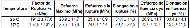 Las propiedades mecánicas de los andamios de fibroína se determinaron usando un microtester Instron 5848 (Canton, MA, USA) en el Laboratorio de Mecánica de la Universidad de los Andes; Bogotá, Colombia. Se montaron tiras rectangulares de 4 x 4 mm. Todos los ensayos se realizaron a una velocidad de extensión de ensayo de 1 mm/min, tanto a 25°C como 37°C, con una humedad relativa de 50-60%. Se utilizó una celda de carga de 0,5 kN. Los resultados fueron obtenidos a partir del uso de 5 probetas de ensayo. Se registraron datos correspondientes a las siguientes variables: Factor de Ruptura, Fr (kN/m), Esfuerzo Máximo: σmáx (MPa), Esfuerzo a la ruptura: σrup (MPa), Elongación a ruptura, Lrup (%), Esfuerzo de fluencia: σys (MPa) y Elongación en fluencia, Lys (%).