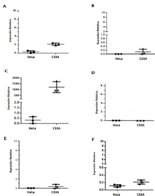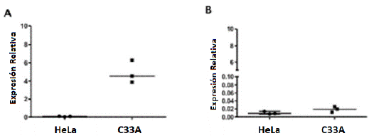 Para el caso de adam17, no se encontraron diferencias estadísticamente significativas entre las líneas C-33A y HeLa; además se observo una expresión baja en las dos líneas celulares empleadas. Estos resultados son contrarios a lo reportado por Xu y colaboradores en el 2013, quienes encontraron altos niveles de la proteína en tejidos con CCU en comparación con tejidos adyacentes no cancerígenos y una alta expresión de ésta se ha asociado con un mal pronóstico en pacientes con CCU (Xu et al., 2013), por lo que podría sugerirse que podría llegar a ser un buen marcador de pronóstico, por lo tanto, era de esperarse que un modelo de CCU en líneas celulares se encontrará una alta expresión de adam17.