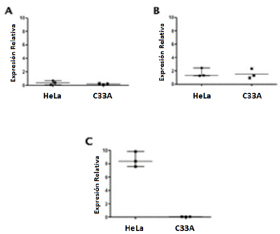 Finalmente, para las desintegrinas y metaloproteinasas, observamos en la figura 3, la expresión relativa para adam10 y adam17 fue similar en las dos líneas celulares evaluadas, sin embargo, la mmp14, mostró diferencias estadísticamente significativas con un p=0.006, con un incremento en su expresión en la línea celular HeLa positiva para VHP18 y una expresión nula en la línea celular C-33A negativa para VPH.