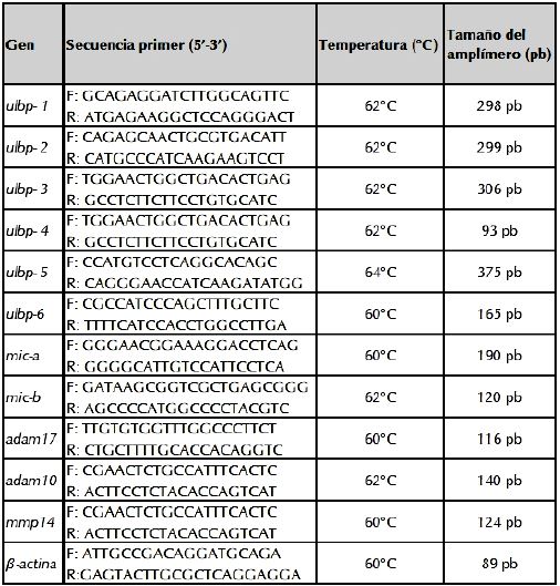 Por lo anterior nosotros evaluamos por primera vez la expresión génica de todos los ligandos descritos (mica, micb y ulbp 1-6) para el receptor activador NKG2D en humano, además de las metaloproteinasas adam10, adam17 y mmp14 involucradas; en las lineas celulares de referencia para el cancer cervical como HeLa positiva para el tipo viral VPH 18 y C33A negativa para VPH.