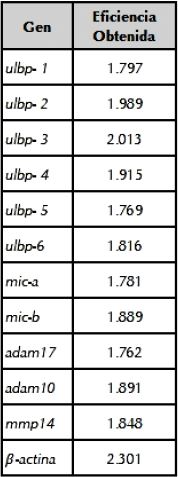 La expresión relativa de los genes de interés ulbp (1-6), mica, micb y metaloproteinasas (mmp14, adam10 y adam17), se realizó a través qRT-PCR por triplicado en las lineas celulares: HeLa (positiva para VPH tipo 18) y C33- A (negativo para VPH). Se obtuvieron valores óptimos de eficiencia para todos los primers de los genes utilizados incluyendo nuestro gen constitutivo de β- actina.
