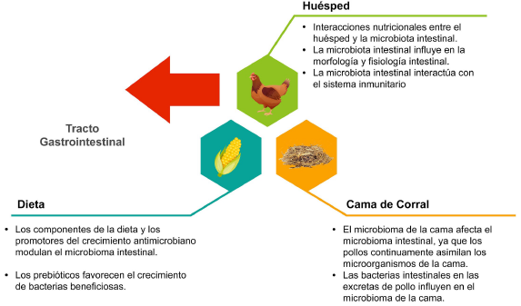 La caracterización del microbioma de aves de corral se centra actualmente en el estudio del tracto gastrointestinal, dado que es el área de mayor abundancia y diversidad bacteriana (O'Hara y Shanahan, 2006), mayor relevancia para la salud del huésped, dado que el mismo desempeña un papel esencial en la digestión y absorción de nutrientes, el desarrollo del sistema inmune y la exclusión de patógenos (Pan y Yu, 2014; Yeoman et al., 2012). Por otra parte, se ha señalado que la dieta (Hammons et al., 2010; Jia et al., 2009) y los aditivos alimentarios (Amerah et al., 2011; Danzeisen et al., 2011) pueden afectar la microbiota gastrointestinal de las aves de corral con respecto a la diversidad y composición (figura 1). En consecuencia, la microbiota intestinal se ve influenciada por factores genéticos y factores externos como la dieta y el ambiente (Apajalahti et al., 2004; Smulikowska, 2006; Wang et al., 2016; Ballou et al., 2016; Wang et al., 2018). No obstante, a pesar de la importancia de la microbiota intestinal, y el papel que tiene en la salud y bienestar de las aves de corral (Awad et al., 2016; Stanley et al., 2013), se ha estudiado de manera limitada la composición y diversidad bacteriana dentro del tracto gastrointestinal; adicionalmente el rol de los microorganismos en el desarrollo de un tracto gastrointestinal saludable aun es desconocido. Se conoce poco sobre la diversidad de este ecosistema, su desarrollo y la respuesta a las infecciones microbianas, principalmente bacterianas, su impacto en el huésped y las interacciones entre la microbiota y el huésped.