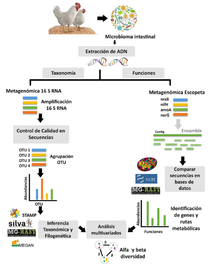 RESUMEN: El pollo y el huevo son una fuente importante de proteína para el ser humano a nivel mundial. La producción de estos alimentos se ha intensificado durante los últimos años y se prevé que se produzca alrededor de 1 50 millones de toneladas de carne de pollo en 2020 (OCDE / FAO, 2018). Sin embargo, uno de los mayores problemas ligados a los procesos de producción avícola lo constituyen las enfermedades infecciosas ocasionadas por microorganismos patógenos. Entre los más relevantes se encuentran microorganismos como Salmonella ssp, Campylobacter spp, y Escherichia coli. Por lo tanto, es importante comprender los mecanismos implicados en la colonización de microorganismos patógenos que afectan a las aves de corral y sus interacciones con la microbiota gastrointestinal las cuales son clave en la mejora de la absorción de nutrientes y el fortalecimiento del sistema inmune, que influye en el crecimiento, el bienestar y la salud de las aves de corral. Sin embargo, hay poca información relacionada con la microbiota gastrointestinal de pollos parrilleros y gallinas productoras de huevo. Hasta hace poco, la caracterización se limitaba a los microorganismos que podían recuperarse a través de cultivos tradicionales. Por lo anterior, en el último tiempo se ha intensificado el uso de técnicas moleculares, entre las que se destaca la metagenómica, la cual ofrece una alternativa para una mejor comprensión de las interacciones bacterianas, la identificación de genes de resistencia a los antibióticos, identificación de elementos genéticos móviles, y el diseño de estrategias para intervenciones más efectivas con el objetivo de romper la cadena de transmisión de microorganismos patógenos durante el ciclo de producción avícola. En esta revisión, se describen los principales enfoques metagenómicos para el estudio de microbiomas de aves de corral, las técnicas de secuenciación y herramientas bioinformáticas usadas para su caracterización.
