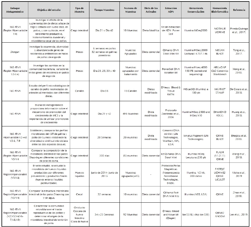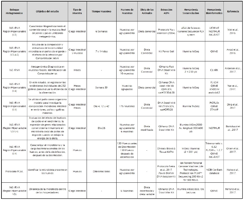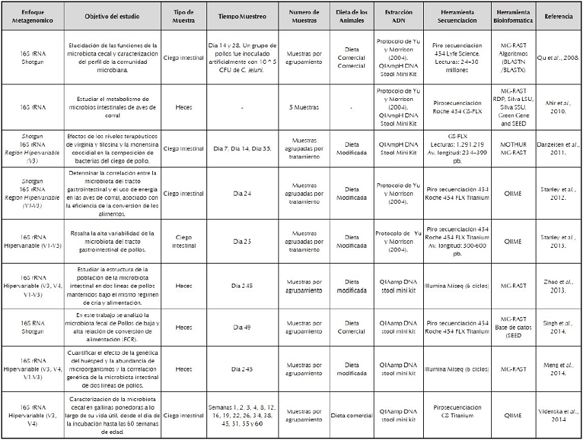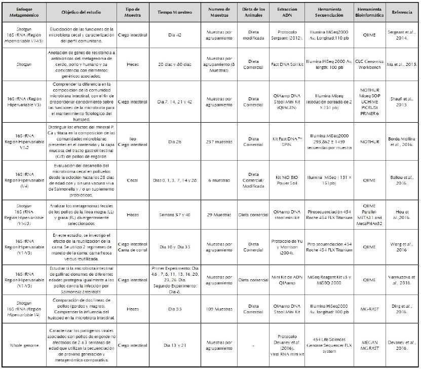 En este sentido, los proyectos metagenómicos del tracto gastrointestinal de pollos se han centrado en las funciones de la microbiota cecal (Sergeant et al., 2014), el papel fundamental de la microbiota de aves en los parámetros de rendimiento y cambios en la dieta (Yan et al., 2017), las comparaciones entre líneas gordas y magras (Singh et al., 2014; Ding et al., 2016; Hou et al., 2016), los mecanismos de respuesta a microorganismos patógenos (Qu et al., 2008), representación del viruloma (Qu et al., 2008) y de los genes de resistencia a antibióticos (Ma et al., 2015; Tong et al., 2017), ver tabla 1.
