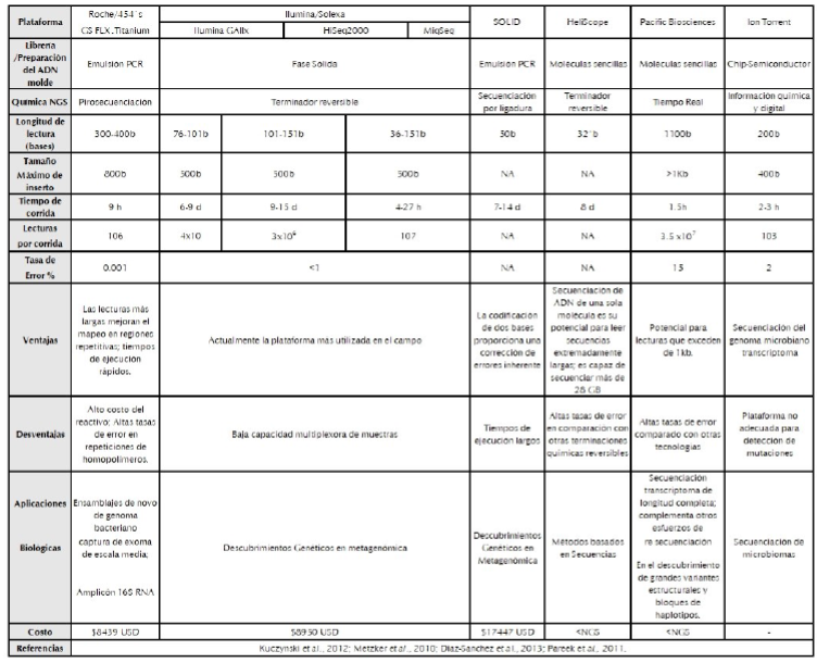 En la tabla 2 se señalan características distintivas de cada tecnología, como longitud de lectura, tiempo de corrida, tasa de error, tamaño de inserción y costo.