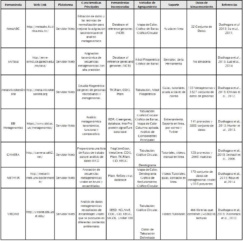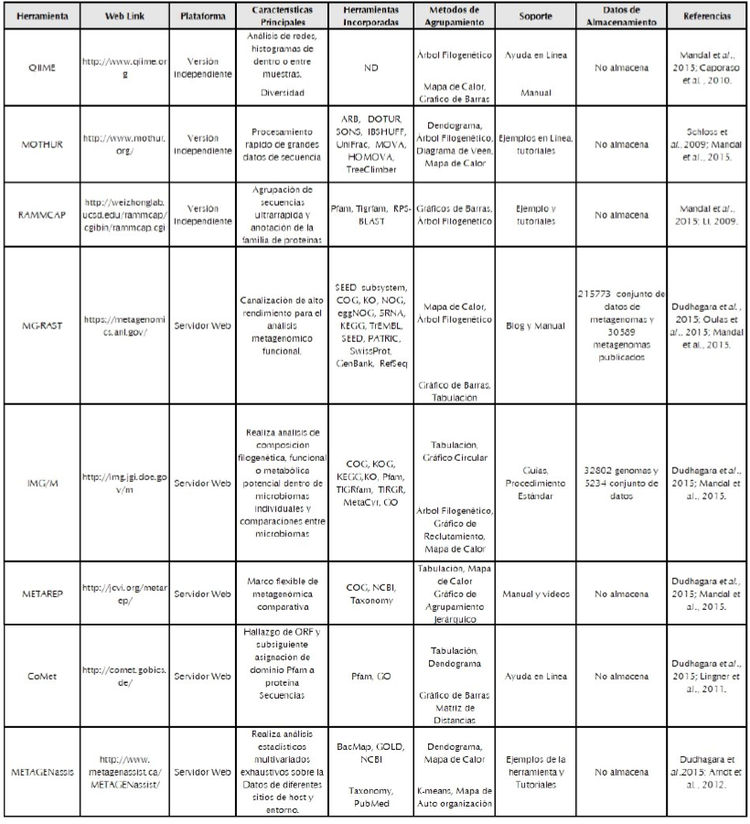 En esta revisión se describen diferentes enfoques bioinformáticos con el fin de soportar la información principal para la selección y aplicación idónea de los mismos en los análisis de datos metagenómicos. Para ello, se han usado diferentes softwares para la eliminación de secuencias de baja calidad y verificación de secuencias quiméricas (Haas et al., 2011), eliminación de errores generados en la secuenciación, producción de un grupo de secuencias casi idénticas denominadas unidades taxonómicas operativas y el análisis estadístico para determinar las diferencias significativas comparadas con la secuencia de referencia (Caporaso et al., 2010), ver tabla 3.