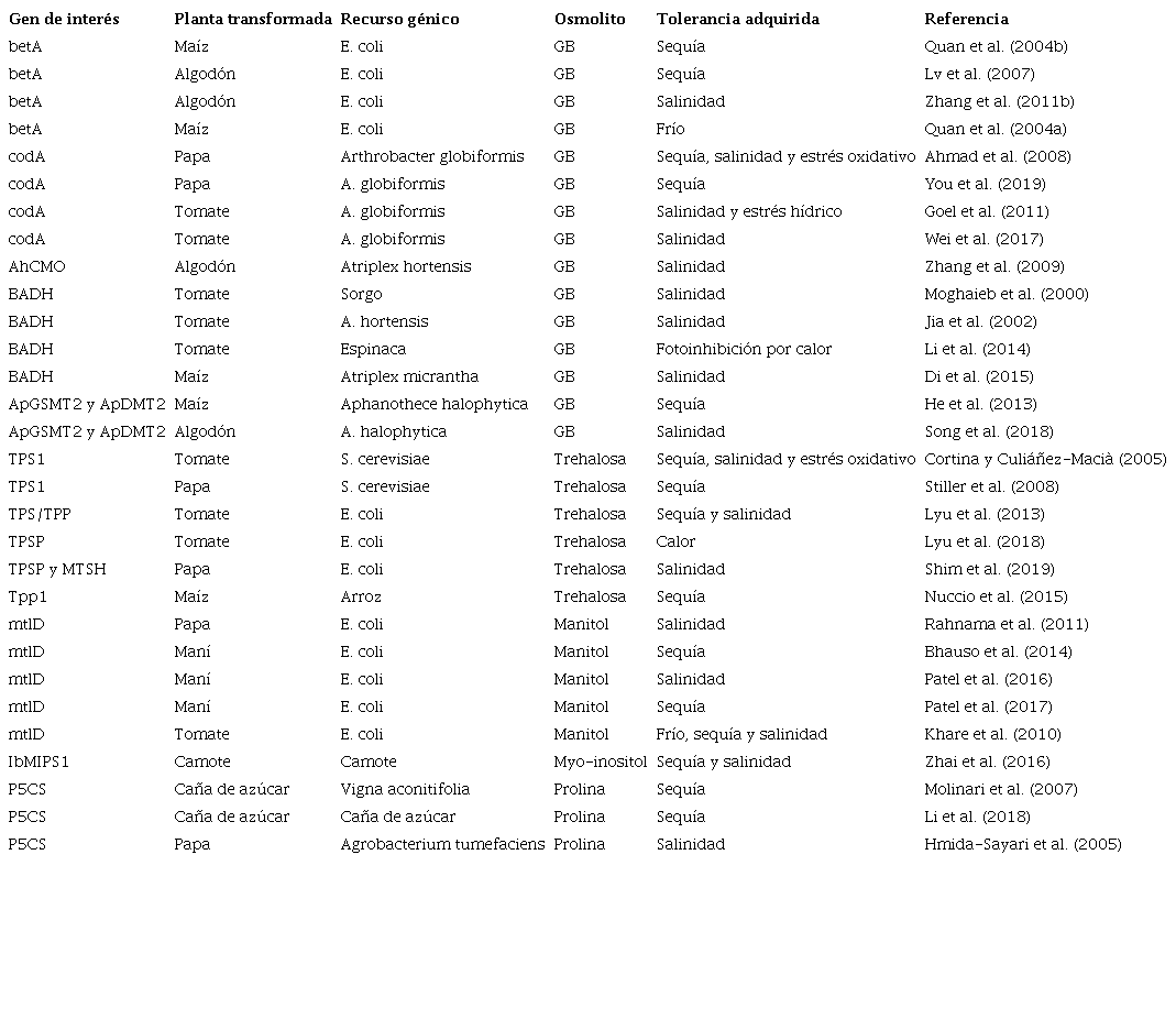 Los osmolitos son sustancias orgánicas o inorgánicas que las plantas tienen la capacidad de acumular. Estos compuestos actúan como osmoprotectores ya que no son tóxicos para la célula, no generan ningún efecto dañino en las membranas, estabilizan la superficie de unión al agua y mantienen la estructura espacial de las macromoléculas. Sustancias orgánicas de este tipo, sintetizadas por las plantas, incluyen azúcares solubles, polioles, prolina, glicina-betaína (GB), ácidos orgánicos, trehalosa, espermidinas, entre otros (Fang y Xiong, 2015; Farooq et al., 2012; Hadiarto y Tran, 2011; Singh et al., 2015). Diferentes cultivos de origen neotropical han sido modificados genéticamente con genes que participan en la biosíntesis de osmolitos (Tabla 1). Estos se han aislado de bacterias (He et al., 2013; Lv et al., 2007; Quan et al., 2004b; Zhang et al., 2011b), levaduras (Dong et al., 2011; Stiller et al., 2008) y también de otras plantas, o bien se ha inducido la sobreexpresión de genes nativos (Moghaieb et al., 2000; Zhang et al., 2009). Lo anterior se ha hecho con el fin de aumentar la acumulación de estos compuestos y, en consecuencia, incrementar la tolerancia de las plantas a condiciones abióticas adversas.