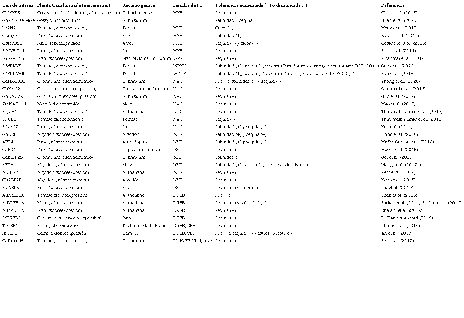 Los FT son proteínas que pueden regular cambios en la expresión de un grupo específico de genes. Entre las familias FT en las que se ha encontrado interacción con genes relacionados con la respuesta al estrés abiótico se pueden mencionar los MYB, WRKY, NAC, proteínas básicas de zipper de leucina (bZIP), y FT de respuesta a la deshidratación (DREB) (Fang y Xiong, 2015; Hadiarto y Tran, 2011; Hussain et al., 2011; Singh y Laxmi, 2015), los cuales han sido empleados para modificar cultivos de origen neotropical (Tabla 2). En esta sección se detallarán ejemplos de aplicaciones que se le han dado a estos FT con miras a mitigar estrés abiótico en especies con un origen en el neotrópico.