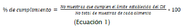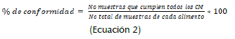 Porcentaje de conformidad de las muestras analizadas para tipo de alimento. El porcentaje de conformidad de los criterios para todas las muestras analizadas se calculó teniendo en cuenta el número de muestras conforme (las que cumplen los CM) sobre el total de muestras analizadas de cada alimento (Ecuación 2).
