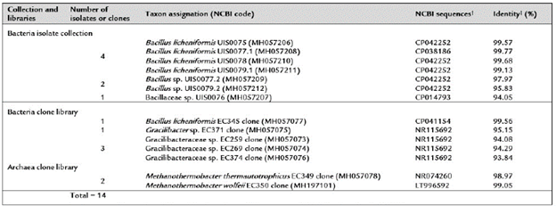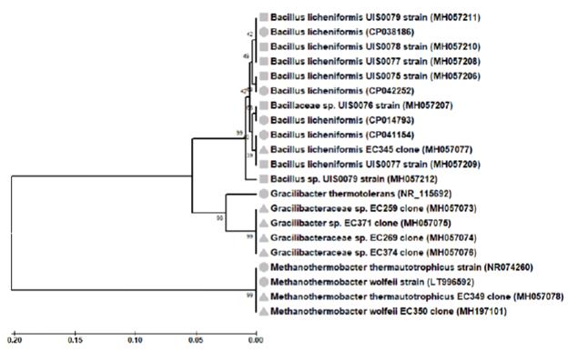 A total of fourteen 16S rRNA gene sequences were obtained from bacteria isolates (7) and from bacteria libraries (7) developed from cultures (Table 2). BLAST analyses of the isolate sequences showed identity values between 94.05-99.77% with NCBI database Bacillus sequences; four of these (MH057206.1, MH057208.1, MH057210.1 and MH057211.1) matched Bacillus licheniformis sequences with identity values higher than 98.7%. One sequence (MH057077.1) from a bacteria clone library also matched B. licheniformis species sequences with an identity value of 99.56%. Further, BLAST analysis of other bacteria clone library sequences (MH057075.1, MH057073.1, MH057074.1 and MH057076.1) showed identity values (93.84-95.15%) with NCBI database Gracilibacteraceae sequences. One sequence (MH057075.1) matched Gracilibacter thermo-tolerans sequences, the type species of the genus Gracili-bacter (Lee et al., 2006), with identity values higher than 95.0%. Similarly, BLAST analysis of the sequences from the archaea clone libraries (MH057078.1 and MH197101.1) showed high identity values (>98.7%) with NCBI database Methanothermobacter thermautotrophicus (NR074260) and Methanothermobacter wolfeii (LT996592) sequences. In summary, the bacterial isolates and clone libraries obtained from coal-enriched cultures indicated that a minimal methanogenic consortium was formed by specie from two bacteria genera (Bacillus and Gracilibacter) and one archaea genus (Methanothermobacter) species. A UPGMA tree based on all 16S rRNA gene sequences (including type species sequences from the NCBI database) defined the same three main prokaryotic groups (Figure 3).