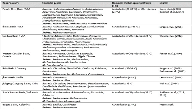 This work constitutes the first effort to identify the composition of microbial consortia involved in methane production in a coal mine from the Bogotá Basin in Colombia. Our results supported de novo biogenic nature of methane gas produced at the La Ciscuda coal mine as previously indicated using δ13C and δ D isotopic signatures (Garcia-Gonzalez 2010). Further, the study identified a minimal methanogenic consortium that inhabited this coal mine, formed by the bacteria species Bacillus licheniformis and Gracilibacter sp., possibly, G. thermo-tolerans (Lee et al., 2006), and the methanogens Methan-othermobacter thermautotrophicus and M. wolfeii (Wasserfallen et al., 2000). Excepting Gracilibacter, these microbial genera have been previously identified from coal-enrichment cultures experiments (Table 3).