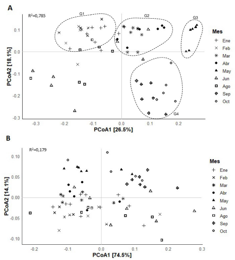 La distribución de la diversidad taxonómica mostró un patrón contrastante al de la diversidad funcional (figura 1). En el caso de la composición taxonómica (figura 1A), se observó la ordenación de las muestras en cuatro grupos: G1 (enero y febrero), G2 (marzo y abril), G3 (mayo) y G4 (septiembre y octubre). Por su parte, en la ordenación de la composición funcional (figura 1B), se observó una agrupación de las muestras solo en mayo, septiembre y octubre. Esto fue coherente con el resultado de la prueba ANOSIM, que evidenció una alta segregación entre los grupos para la composición taxonómica (ANOSIM - R2 =0,785); diferente a lo encontrado para la composición funcional, donde se observó una mayor dispersión entre las muestras de cada mes (ANOSIM - R2 = 0,179).