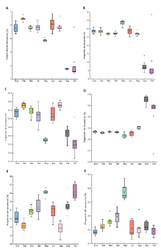 También se observó que funciones como nitrificación, reducción asimilatoria de nitrato y oxidación y reducción desasimilatoria de sulfato estuvieron poco representadas en las muestras y que, aunque sus abundancias fluctuaron en el tiempo, siempre se mantuvieron por debajo de 6%, 5% y 0,5%, respectivamente (figura 2A, 2D y 2F). Mientras que, desnitrificación, reducción desasimilatoria de nitrato y reducción asimilatoria de sulfato fueron los procesos más abundantes (figura 2B, 2C y 2E).