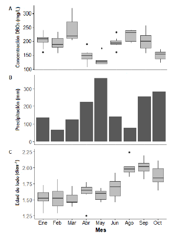 En el comportamiento anual de la precipitación (figura 3B) se evidencia que los meses de abril, mayo, septiembre y octubre presentaron en 2018 los niveles más altos de precipitación. Esos meses corresponden al período del año en el que la concentración de DBO5 en el afluente de la PTAR presentó los niveles más bajos (figura 3A). Por otro lado, en los meses de agosto, septiembre y octubre, la PTAR trabajó a una mayor edad de lodos en comparación con los otros meses (figura 3C).