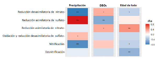 Se realizó un análisis de correlación con el fin de explorar los parámetros de la planta que podrían estar relacionados con la variación temporal en la abundancia relativa de los números KO descrita anteriormente. Se pudo observar que la precipitación acumulada y la edad de lodos se relacionaron significativamente con la mayoría de los procesos (figura 4). Se encontró una relación positiva entre la precipitación y la abundancia de números KO asociados con el metabolismo del azufre. En contraste, la precipitación se relacionó negativamente con la abundancia de KO correspondientes a la reducción desasimilatoria de nitrato y a la nitrificación. Adicionalmente, se evidenció que la concentración de materia orgánica (DBO5) del afluente se correlacionó positivamente con la abundancia de KO asociados a la reducción desasimilatoria y asimilatoria de nitrato y, negativamente con la abundancia de aquellos asociados con la reducción asimilatoria de sulfato. Por otra parte, se observó que la edad de lodos se relacionó negativamente con la abundancia de KO de las rutas de reducción desasimilatoria de nitrato, nitrificación y desnitrificación y solo positivamente con la abundancia de KO asociados con la reducción asimilatoria de sulfato.